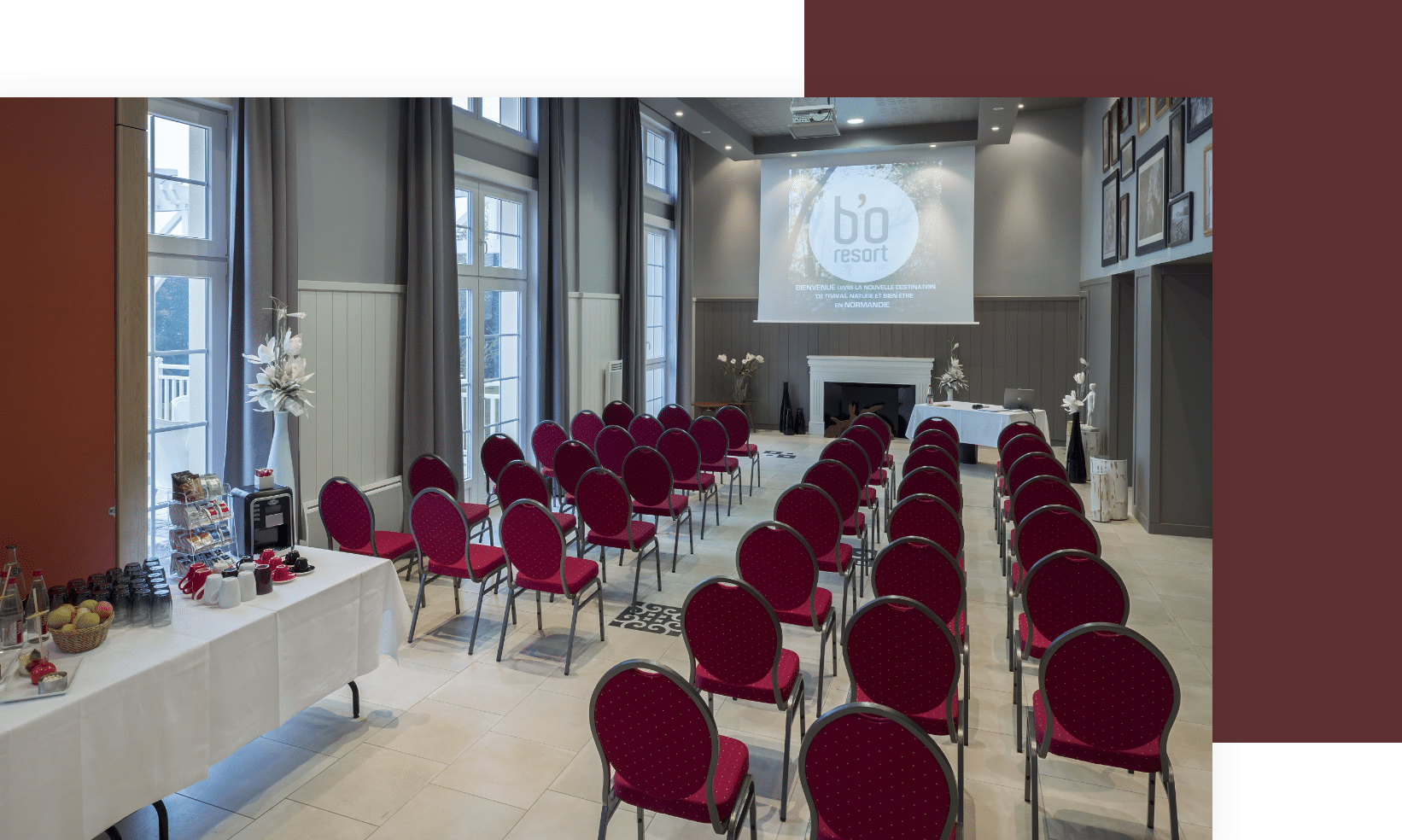 Pour vos séminaires, conventions et autres évènements d’entreprise, b’o resort vous permet de privatiser des espaces adaptés à vos besoins, au sein du complexe thermal ou dans la ville de Bagnoles de l’Orne.